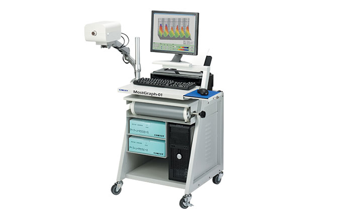 呼吸中にマウスピースをくわえ、安静に呼吸するだけで気道の通りにくさ(気道抵抗)を測定する呼吸機能検査です。